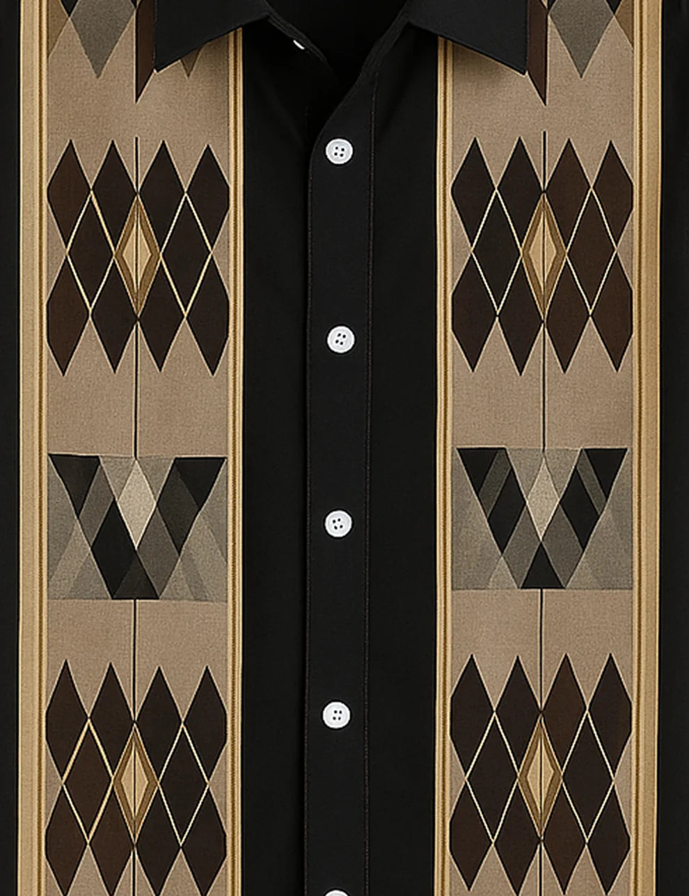 Black Geometric Panel Short Sleeve Shirt – Retro Diamond Pattern Button-Down
