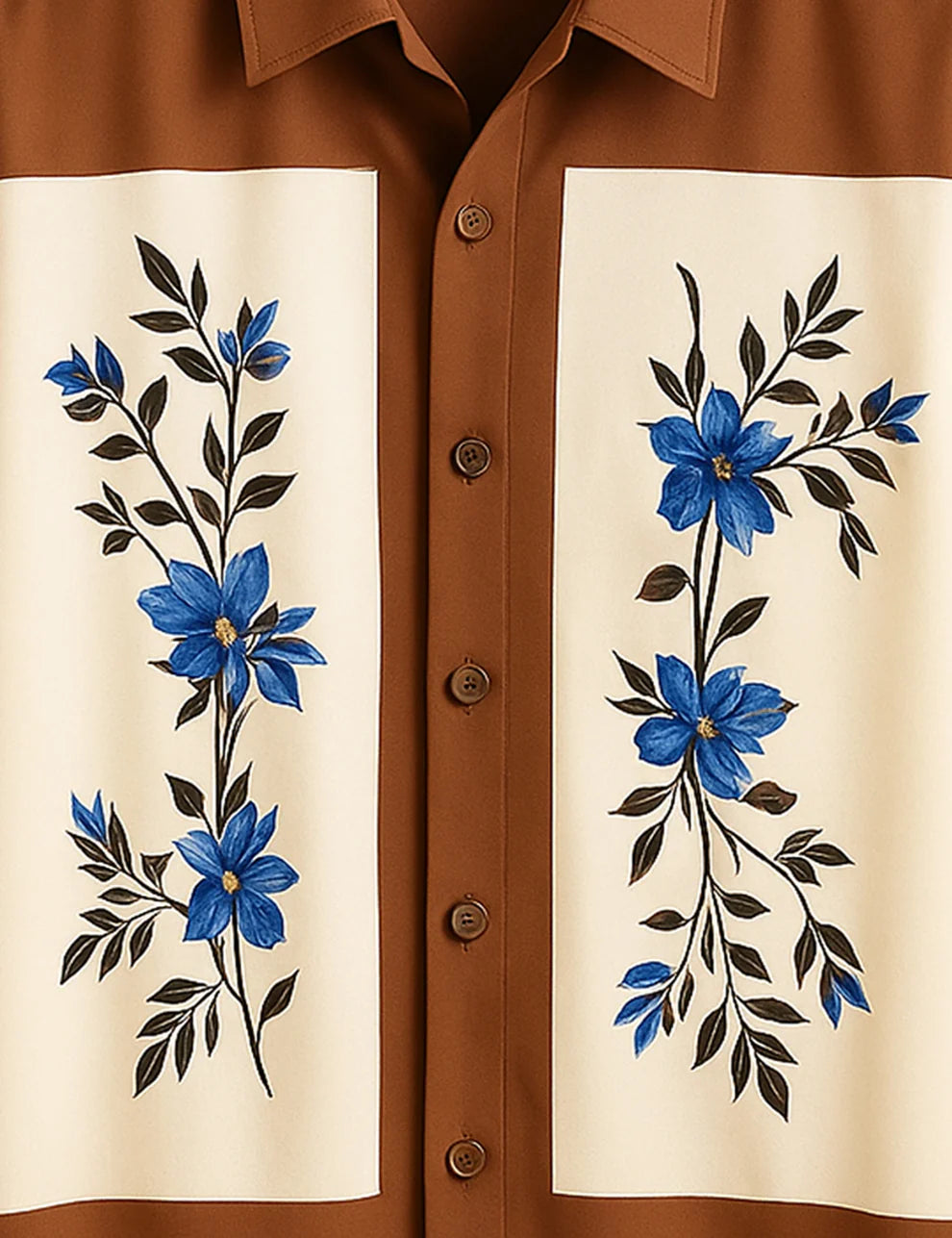 Brown & Cream Floral Panel Short Sleeve Shirt – Vintage Botanical Button-Down