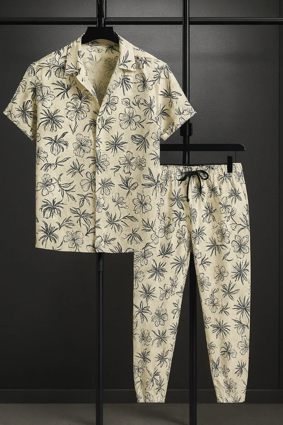 Upgrade your everyday style with this premium cream floral print men’s co-ord set, designed for a classy yet relaxed summer look.